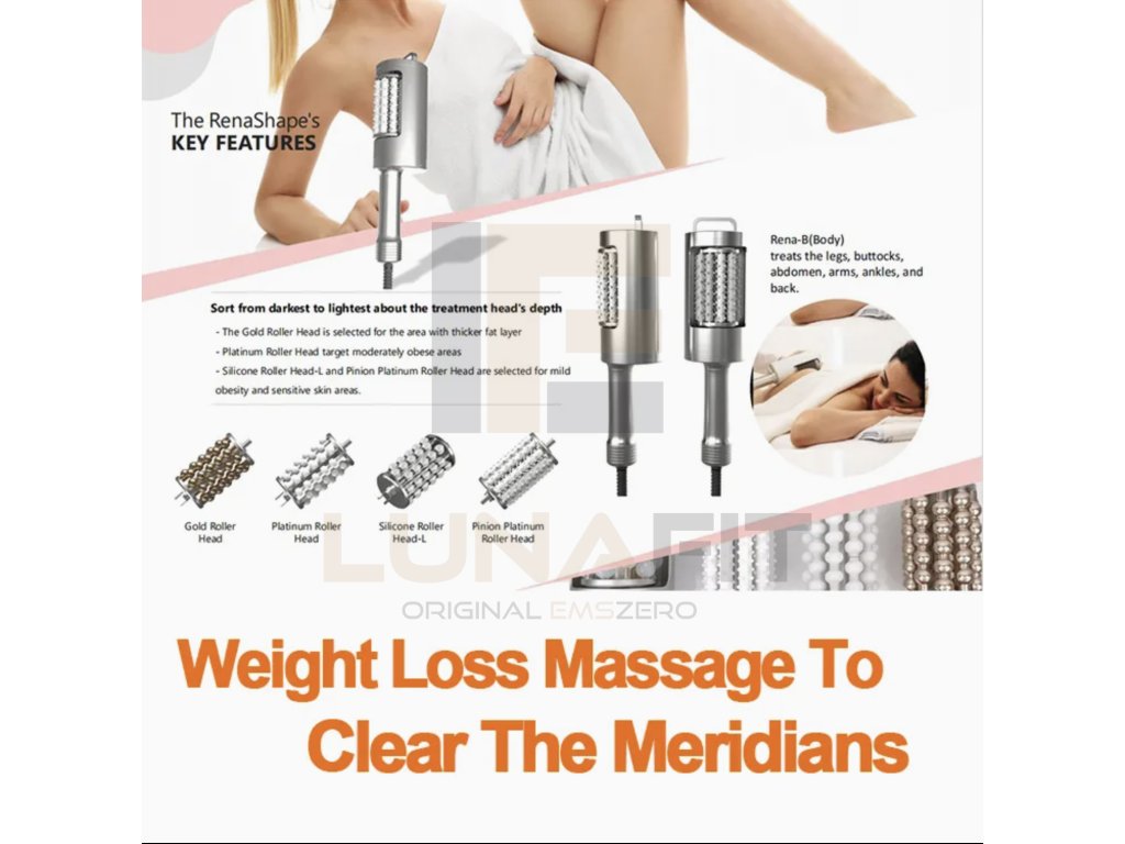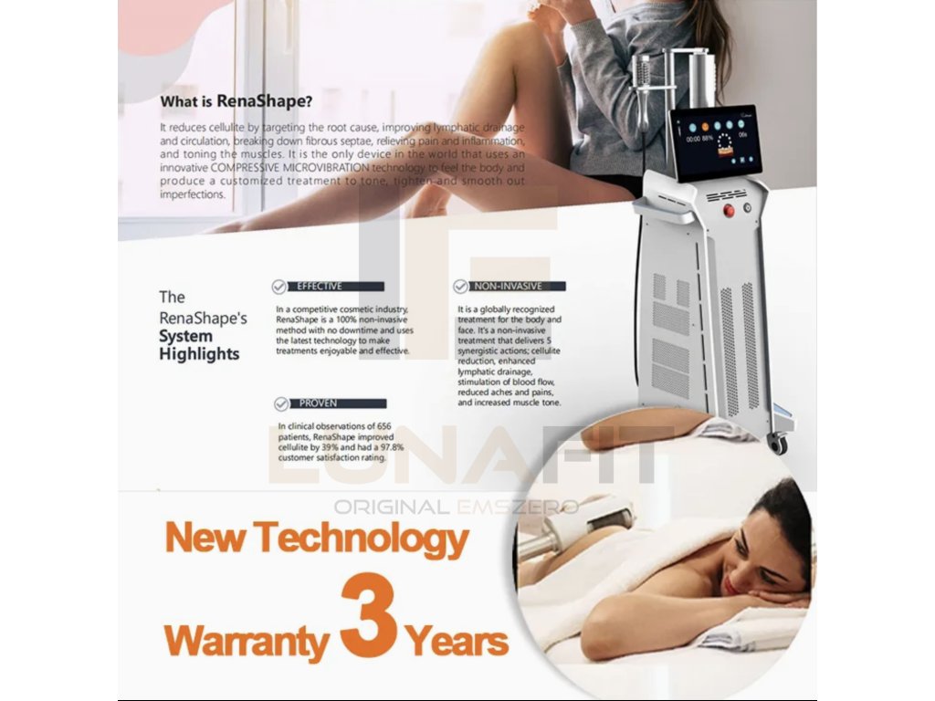 Renashape® kombinuje masážní metodu s vibračními válečky a infračervené záření a představuje novou éru v léčbě estetických a rehabilitačních patologií. Tato patentovaná technologie inteligentně kombinuje mikrovibraci a mikrokompresi a vytváří silnou frekvenci pulzním, rytmickým působením, která proniká z horní vrstvy kůže hluboko do svalu. Spouští rozpad vláknitých sept a urychluje lymfatickou drenáž. S 8 typy léčebných režimů vytváří pulzní rytmické působení na tkáně, které tvarují problémové oblasti, jako jsou nohy, paže a břicho.